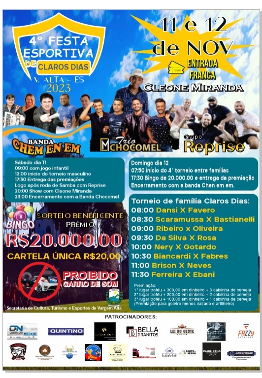 Acontece nos dias 11 e 12 de novembro de 2023, 4⁰ Festa Esportiva de Claros Dias, no município de Vargem Alta-ES.