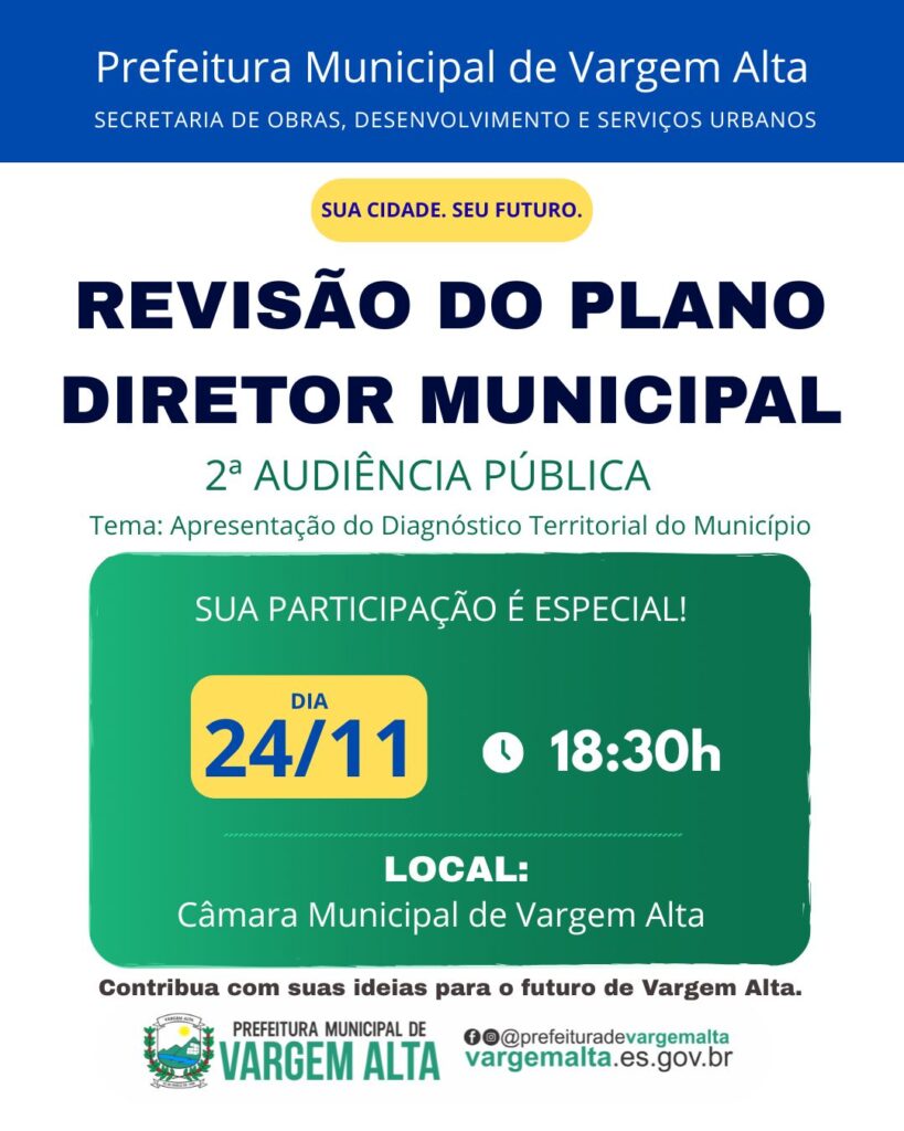 A Prefeitura de Vargem Alta, o Conselho Municipal do Plano Diretor Municipal (PDM) e o Instituto Igetch convidam toda a população de Vargem Alta para participar da 2ª Audiência Pública de Revisão do Plano Diretor Municipal, que tem como objetivo a apresentação do diagnóstico territorial do município.