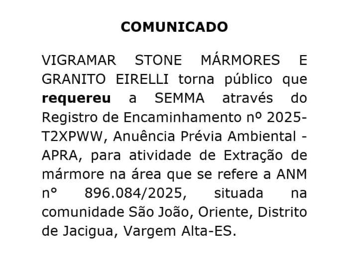 O encontro acontecerá no dia 24 de novembro, às 18h30, na Câmara Municipal de Vargem Alta.Publicidade Legal